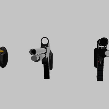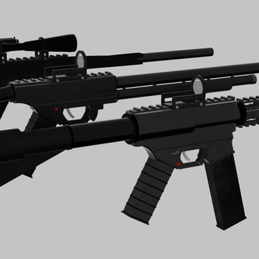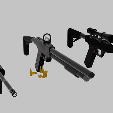 My personal collection of firearms. Includes 4 firearms (assault rifle, sniper rifle, shotgun, pistol). Includes red dot sight and zoom scope. Includes picatinny rails for custom attachments. Includes fore-grip attachment, and adjustable stock.